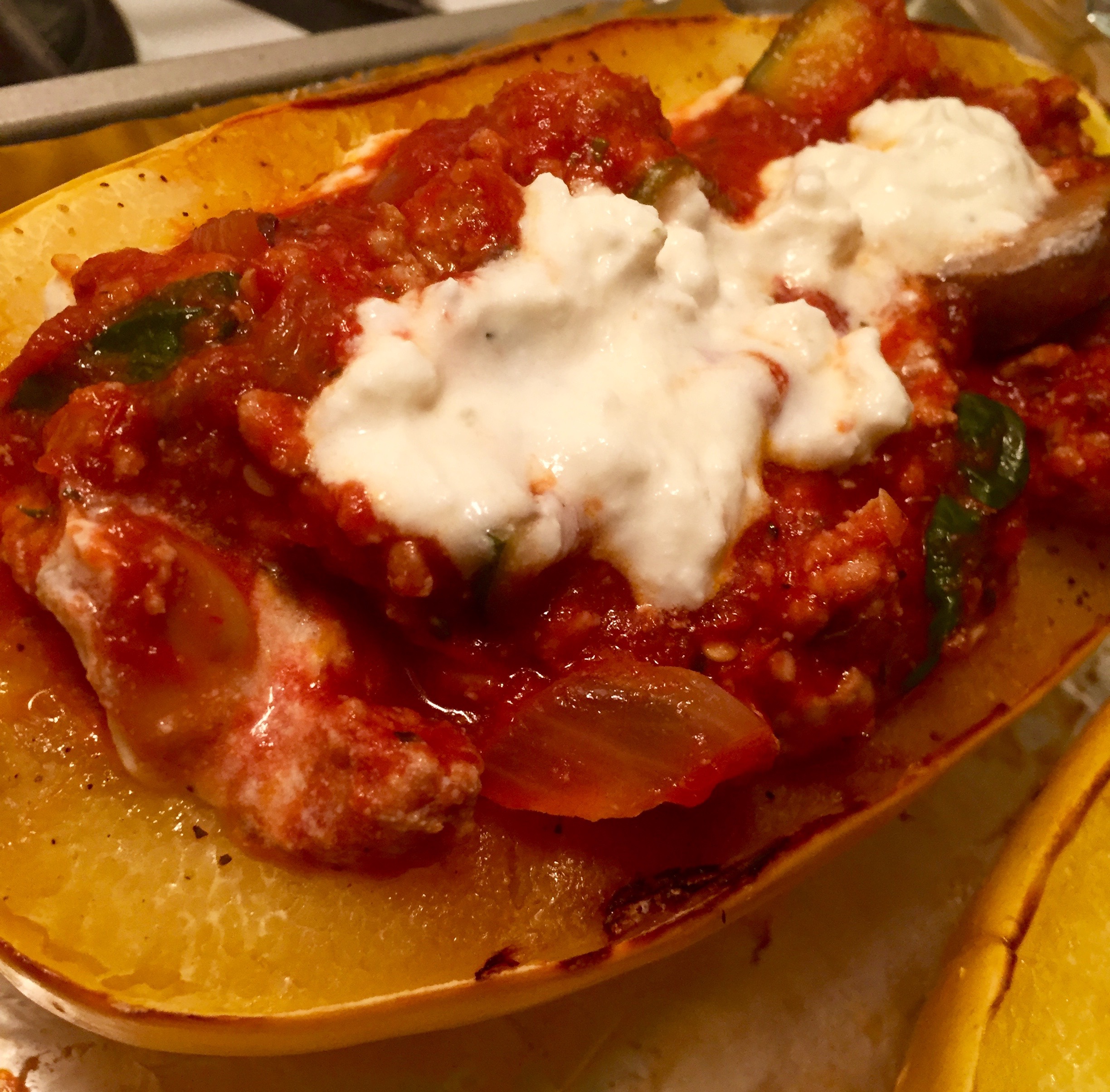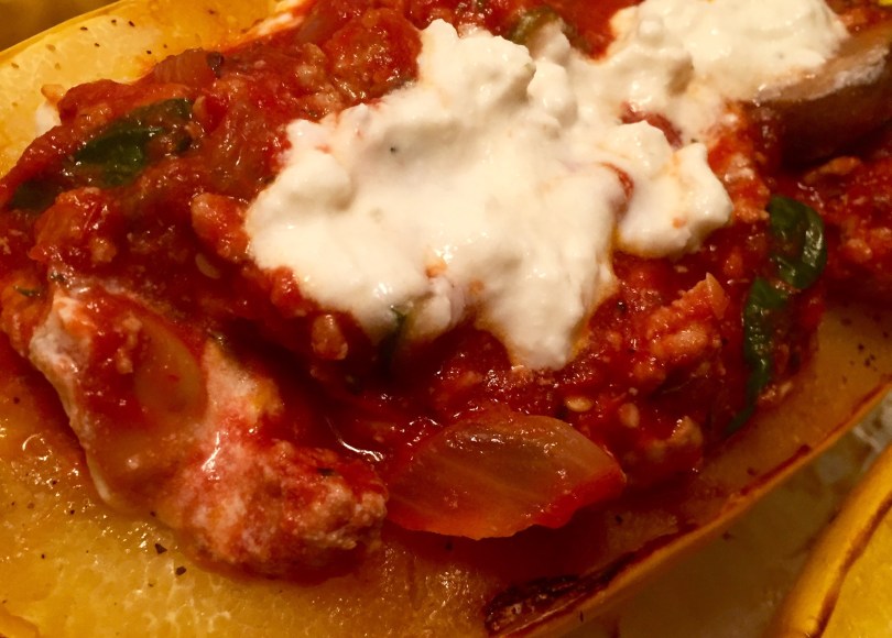 - When the squash is fully cooked turn it face up and evenly divide the sauce and cheese mixture onto all 4 halves. Assemble each squash by putting there sauce on first followed by the cheese mixture.