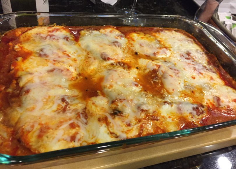 - In a 9 by 13 inch baking dish spread a thin layer (about 1/2 cup) of marinara on bottom of dish. Top with a layer of eggplant and then dollop ricotta cheese on top of eggplant (use about 1/3 of the mixture).