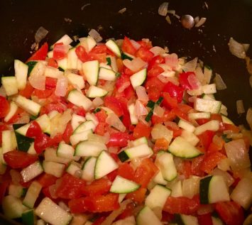 3. Add peppers and garlic and cook for about 3 minutes. Add zucchini and stir.