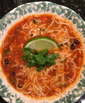 Chicken, beans, veggies, spice, cilantro, cheese…in a soup! What more could you need? This soup is filled with hearty mexican-style spices with tons of veggies and some chicken and black beans for protein. I find that some soups need to be more filling, but the chicken and beans in this soup definitely do the job. A one pot meal that is completely satisfying for the whole family. This soup is easy to prepare and does not require tons of ingredients that some soups need. It also has at least half of the sodium that normal soups do. Sodium is commonly the hidden enemy with soups so it is important to try and reduce it as much as possible. The low sodium chicken broth, V8, and low sodium beans really help to reduce the salt content, and these ingredients still provide all of the tasty flavors!